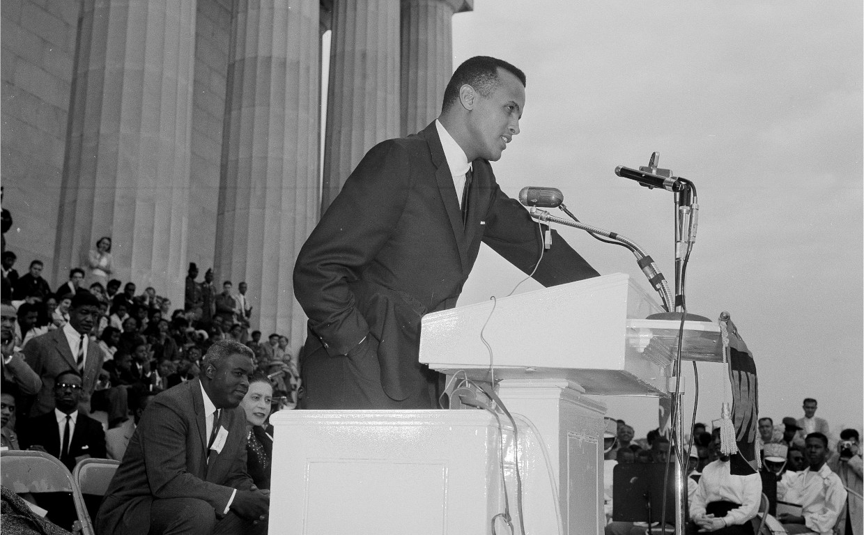 Harry Belafonte speaking at a lectern at the Youth March for Integrated Schools. Jackie Robinson can be seen sitting behind him at left. Associated Press