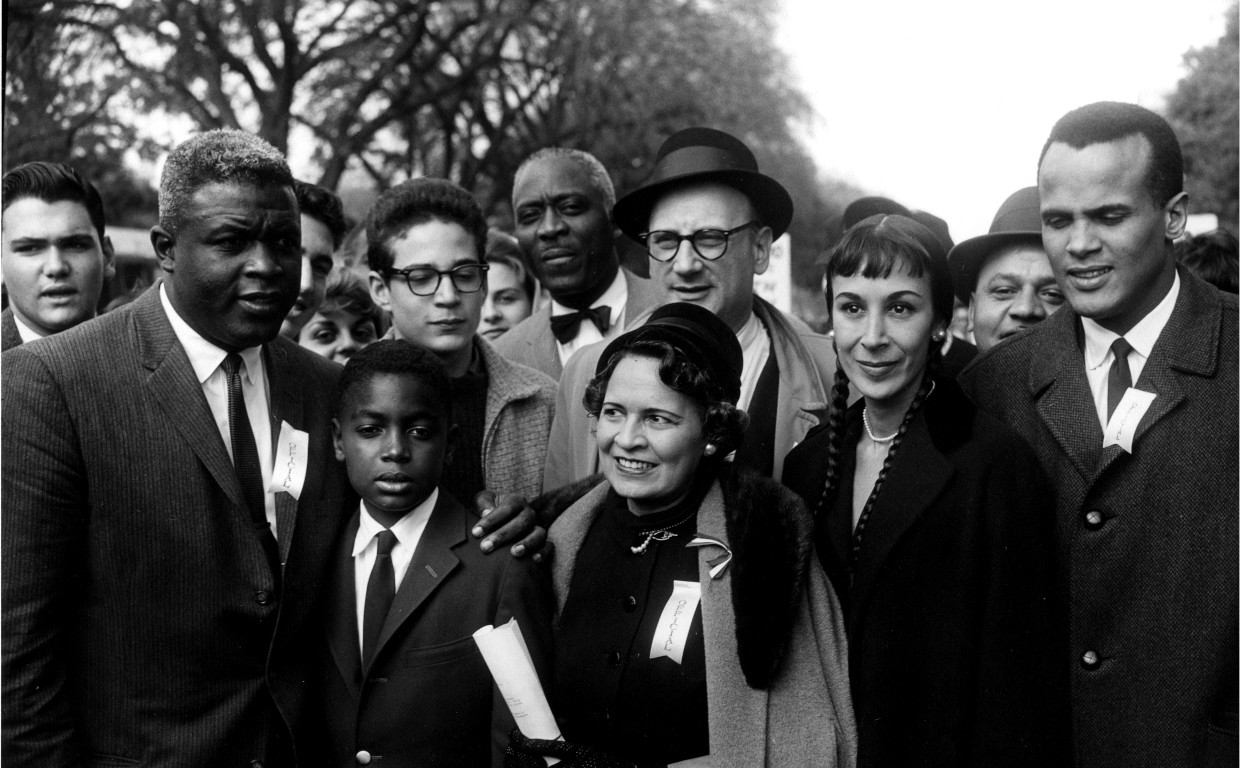 Jackie and David Robinson join march organizers A. Philip Randolph (center, in bowtie) and Daisy Bates (front center), as well as dancer Julie Robinson and her husband Harry Belafonte (both at right) at the Youth March for Integrated Schools. Getty Images