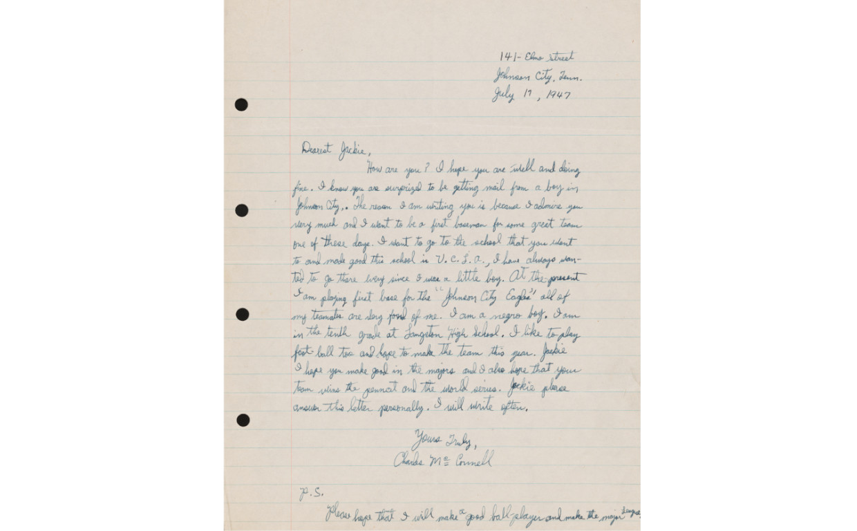 How do we tell the stories behind the artifacts at the Jackie Robinson Museum? Sometimes the answers to our questions can be found as close to our doors as Harlem or Flatbush. In many cases, however, the stories begin in cities and towns hundreds of miles away from the confines of Ebbets Field. On July 19, 1947, Charles McConnell, a Black teenager living in Johnson City, Tennessee, picked up his pen and began to write one of those stories.